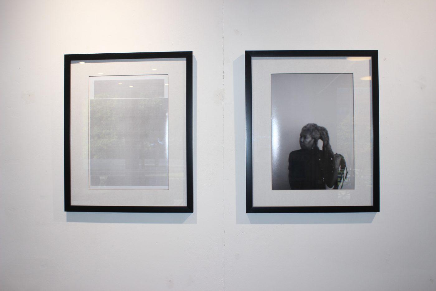 Image description: A short video plays on a large TV screen showing Marley in a studio space physically ordering the pages of a book he is making. The soundtrack is an ambient song and the video plays on loop. It begins with Marley sitting looking at the pages to be ordered and then him moving the pages around and putting them up on the wall, changing the order a few times. Next to the video, on a wall are 2 framed black and white photographs sitting side by side. There is a grainy blur to both images. The photograph on the left hand side, is an image of a document, holding only redacted information. Big inky blocks cover up information, no words are readable underneath. In the photograph on the right, a Black woman sits. She is in her fifties maybe, her hair is tied up and she is holding the end of her locs while looking away from the camera. She is wearing a dark coloured blouse. She is slightly out of focus, she seems pensive.