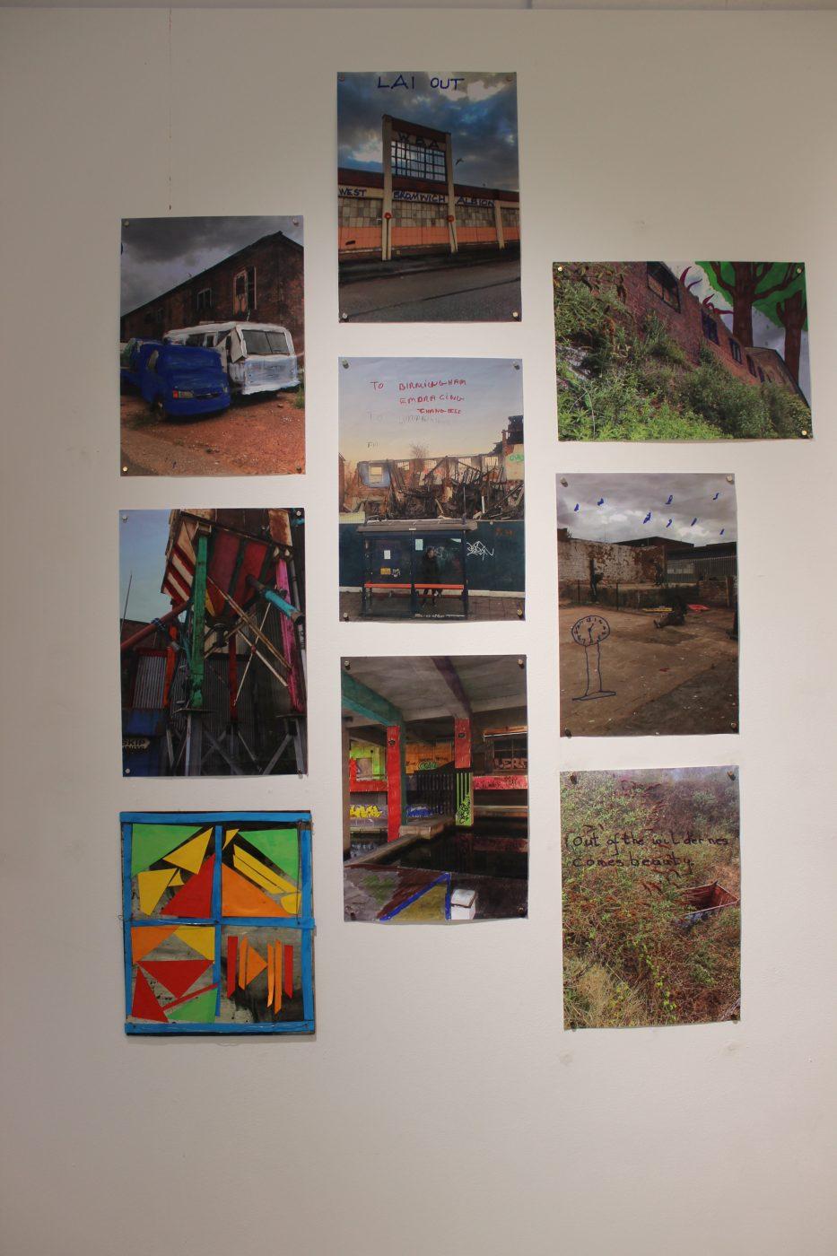 As part of the residency Japhet led a series of workshops with community members from the Dorothy Parkes Centre in Smethwick. The 9 collaged photographs and the sculpture were created during these workshops. In the collaged photographs community members imagined transforming local disused spaces into community spaces. They feel like speculative drawings, one reads, ‘out of the wilderness comes beauty’, another reads ‘to Birmingham, embracing changes’. The invitation to share a collective process and the everyday is felt across all of the works, and feels generous. The artworks feel interconnected and Japhet’s choice to share the journey of Bournbrook DIY, a collective he is involved in, captures a moment in time and works as a celebration of what is achieved together.