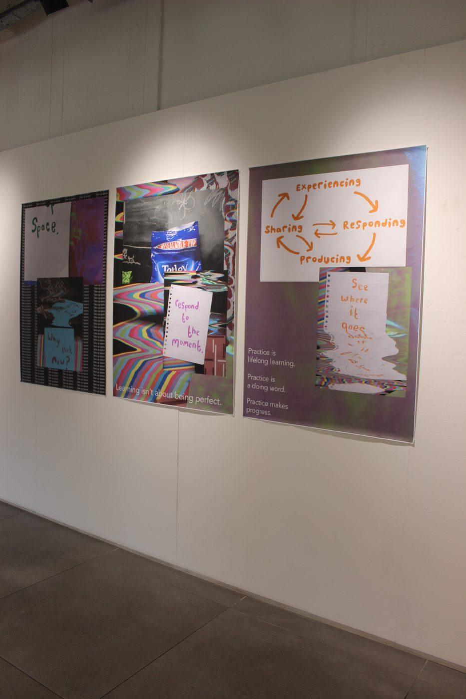 Image description: 3 big (A0 size) posters hang alongside each other on a wall. Each poster is a carefully designed image with bright handwritten notes layered on top of separate bits of patterned paper, like how you might arrange reminders/notes to yourself on your desk. All of the posters have a digital collage feel, they feel playful, some parts are glitchy like a scanned image moved too fast, the colours are bright. From left to right, on the first poster there is a big sticky note saying ‘Space’ above another which reads ‘Why not now?’ These are layered over written columns with repetitive lines of the instruction ‘take up space’ repeated. In the second poster, there is an image of an open packet of tea and some doodles in the background, below this is a handwritten note that reads ‘respond to the moment.’ There is some digital text at the bottom of the poster, ‘learning isn’t about being perfect’. The third poster contains a photo of a handwritten mind map, it reads ‘experiencing>sharing>producing>responding’. These words are connected by arrows, linking them all to each other in a cyclical loop, there’s also arrows going in between them too. There is also a handwritten note reading ‘See where it goes’, and digital text at the bottom of the poster reading, ‘Practice is lifelong learning. Practice is a doing word. Practice makes progress.’