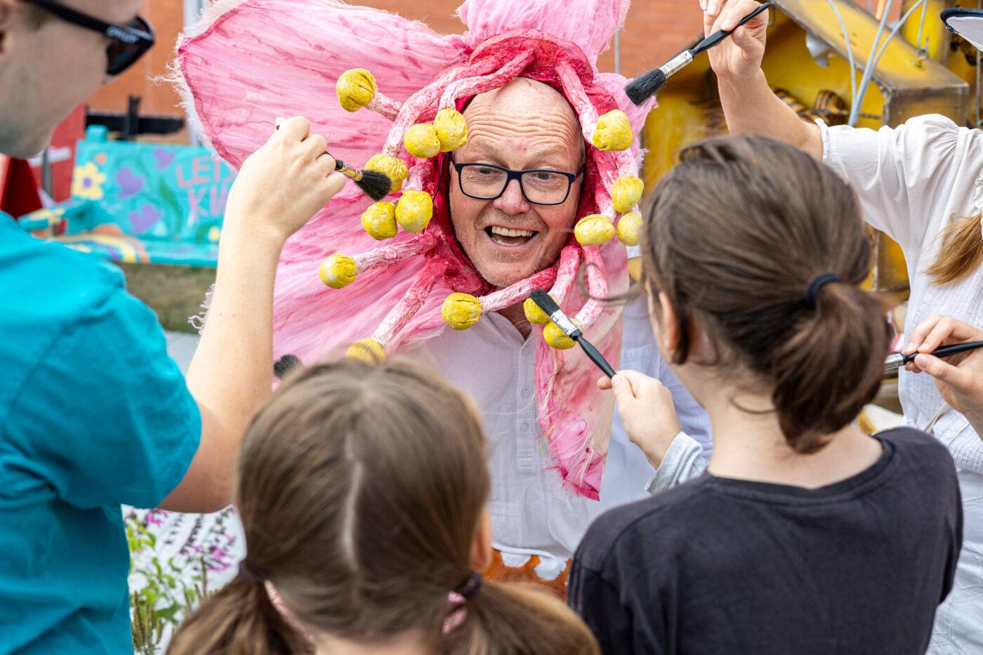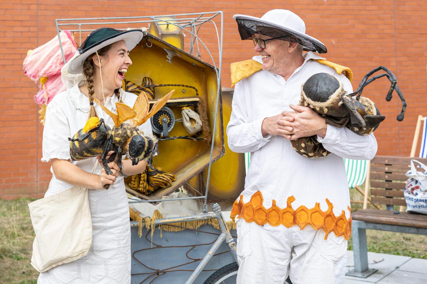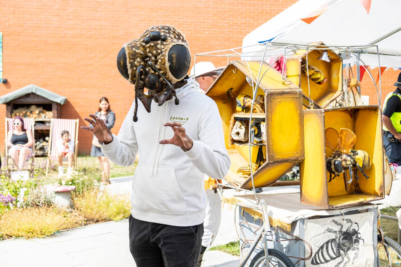 Roaming theatre duo Bee Cartby PifPaf Theatresed humour, intricate props, and fantastical costumes to deliver an interactive educational performance that teaches audiences about the importance of protecting bees. The Bee Cart took to the streets of West Bromwich’s town centre and moved around the meadow to spread their joy and awareness around bee wisdom.