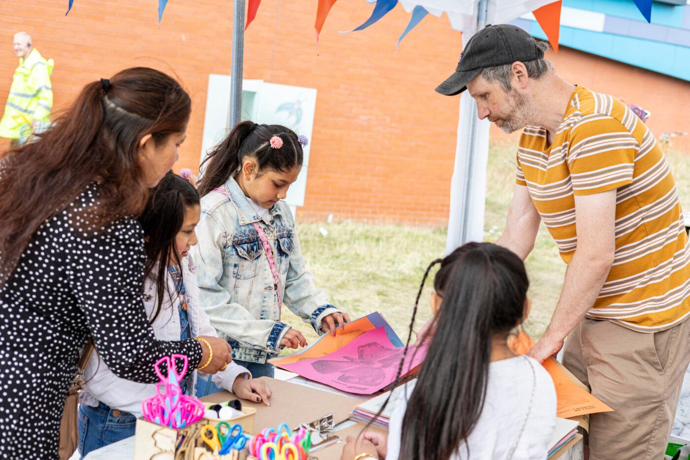 On Saturday 16 August 2025, Multistory hosted Green Roots on the Meadow, our free and family-friendly annual celebration that forms part of our Green Roots in West Bromwich programme. Taking place at the wildflower meadow behind Primark at New Square shopping centre, the day brought together art, music, theatre, and hands-on activities, with a particular focus on connecting people to nature and to one another.