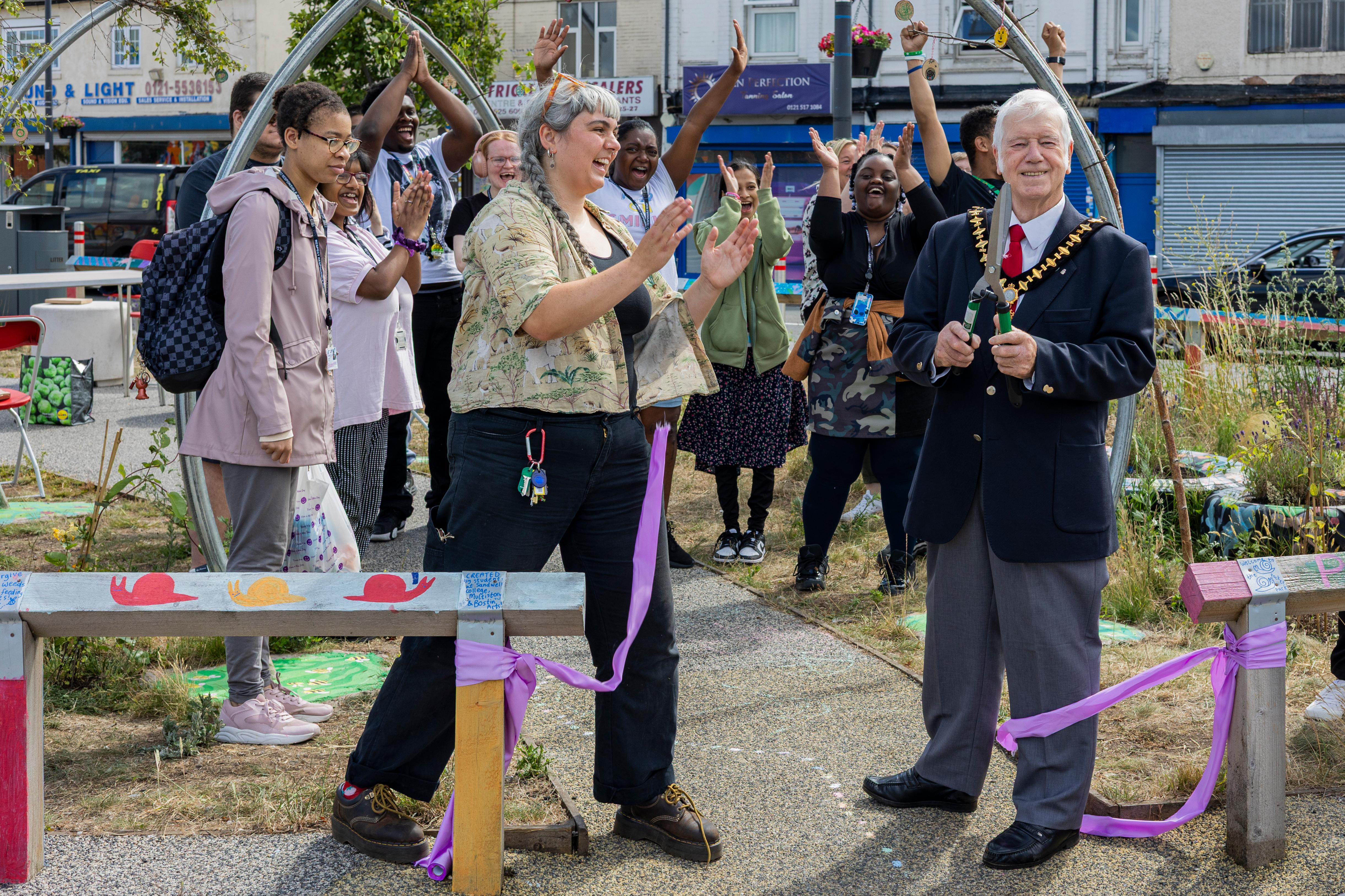 In June, we celebrated the official opening of the Pocket Park on Bull Street in West Bromwich. Starting in September 2024, Ruby Lewis, from local arts collective Bostin’ Arts, worked closely with learners from Sandwell College’s Foundation Learning Department, hosting weekly design, drawing, poetry and planting workshops, culminating in the development of a pocket of wilderness in the urban bustle of West Bromwich town centre. The Pocket Park is filled with the creative endeavors of the learners and it has blossomed over the course of the academic year into a thriving communal space, full of wilderness, greenery and creative elements for everyone to enjoy.