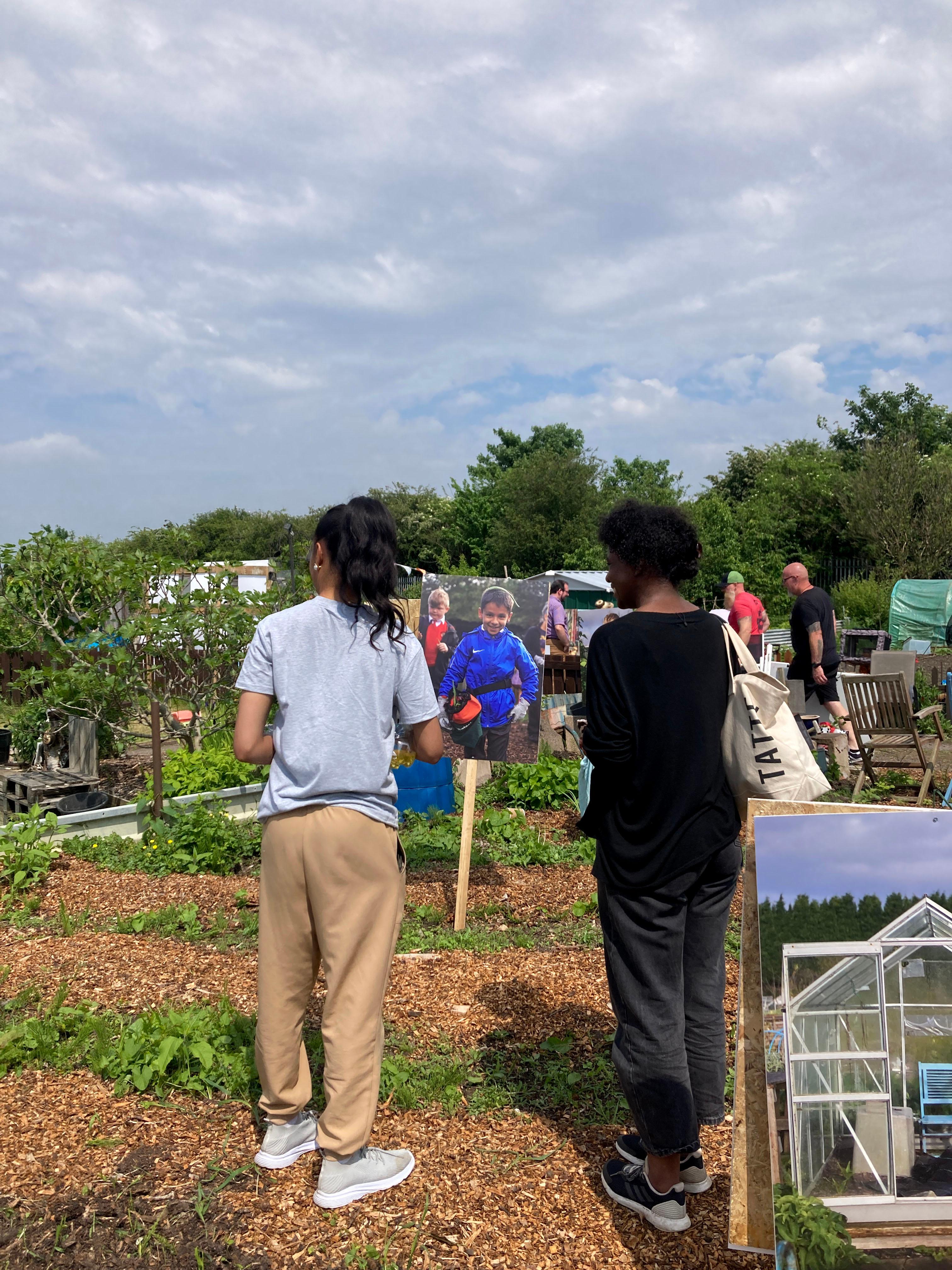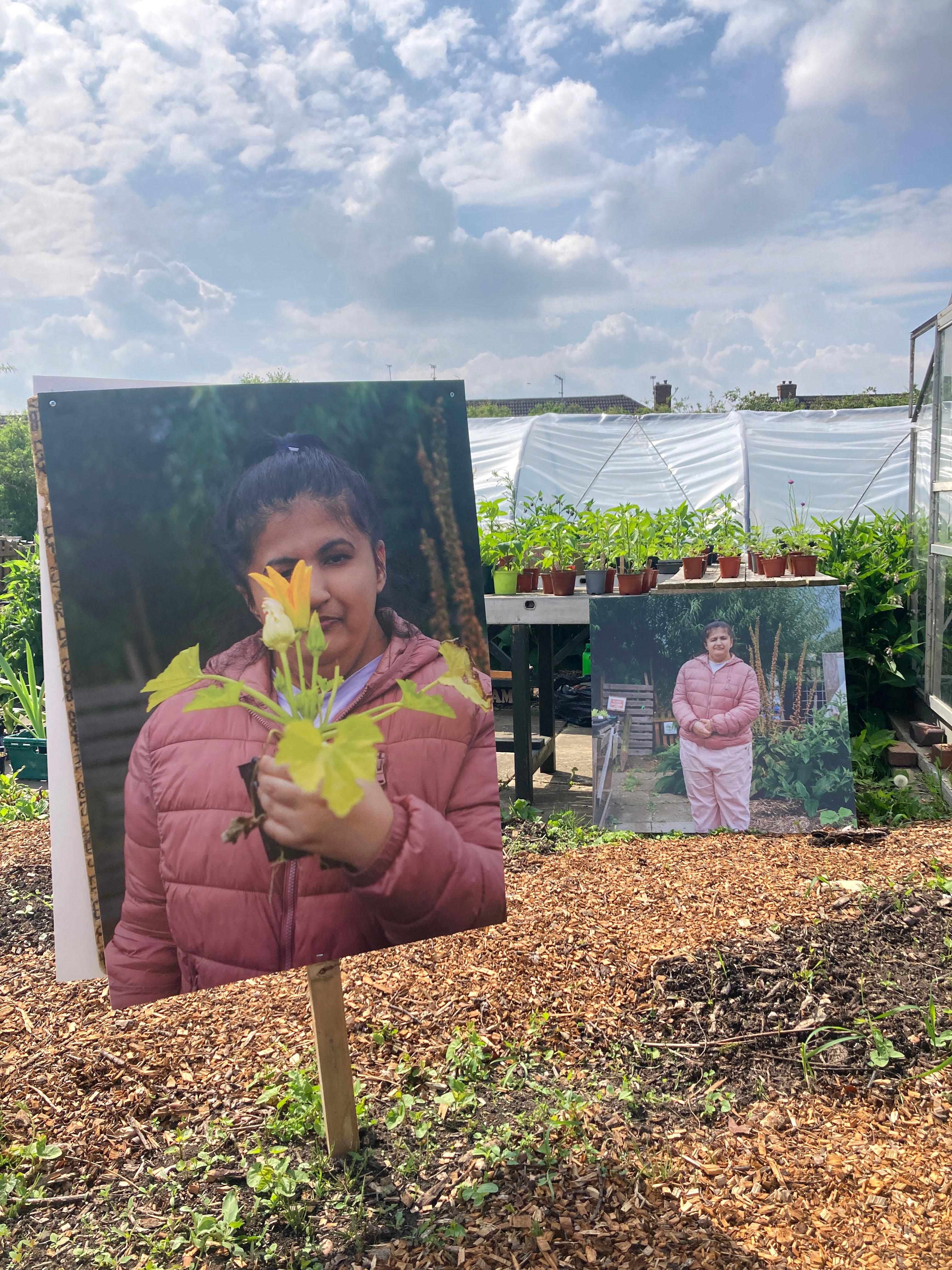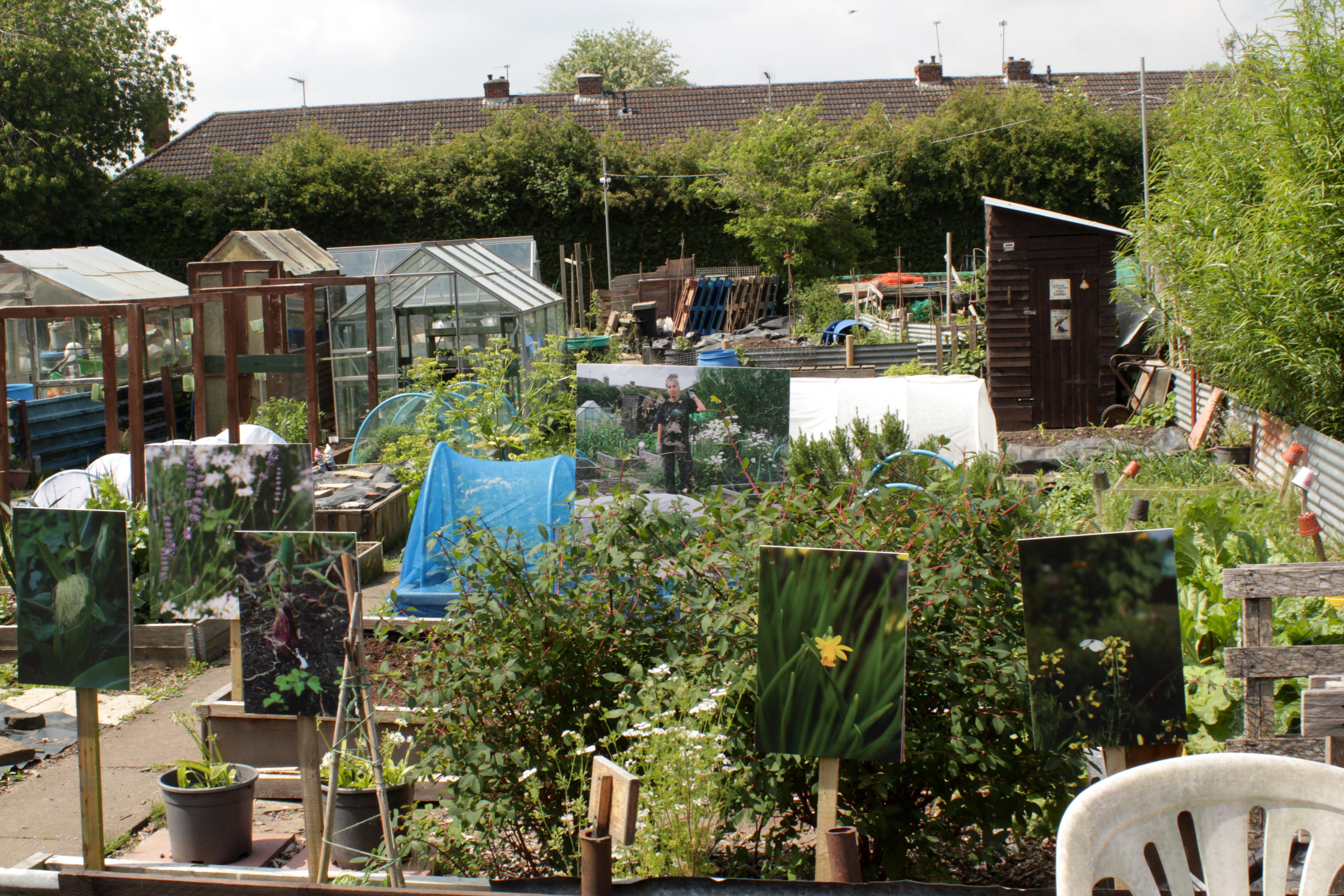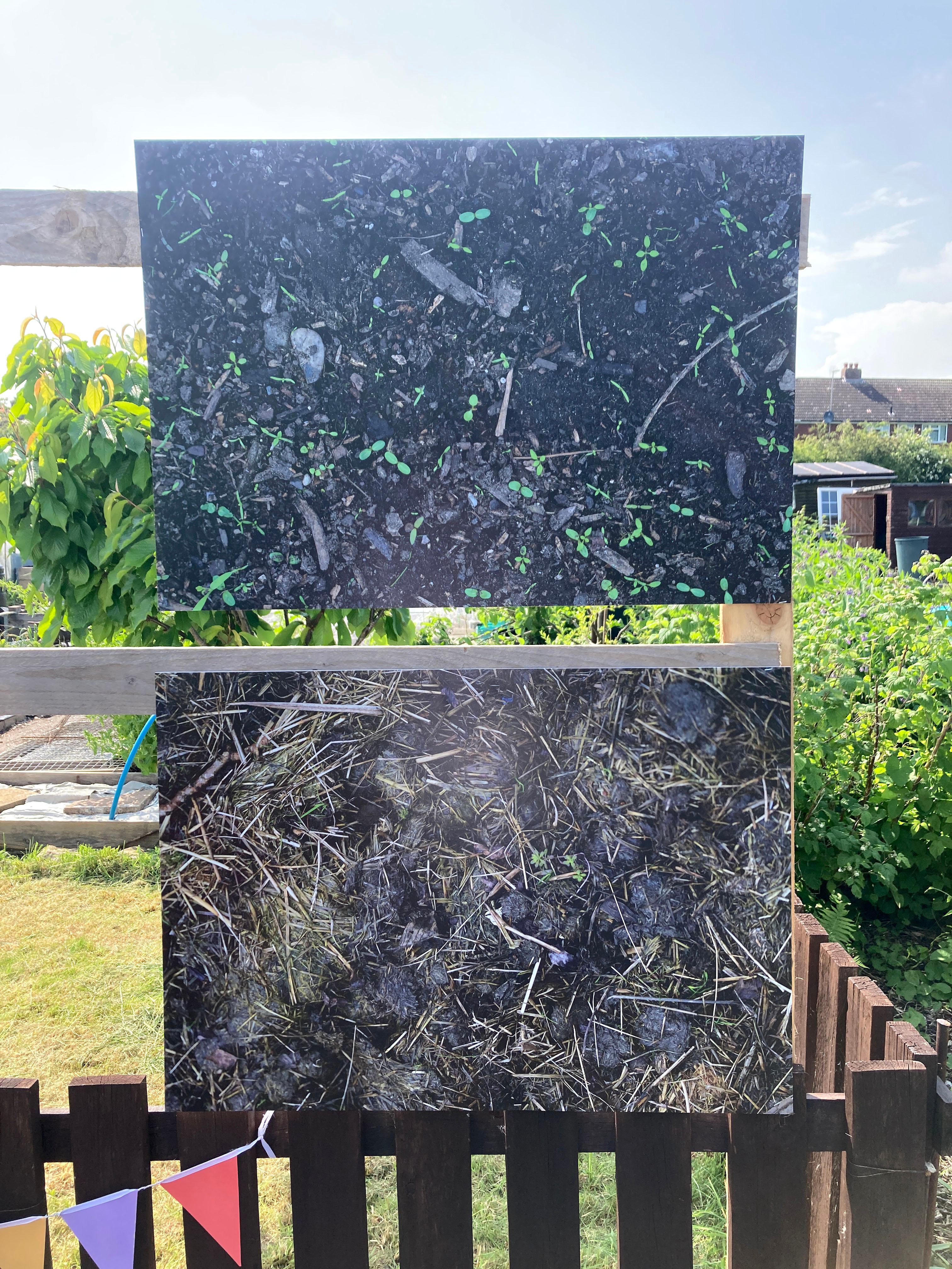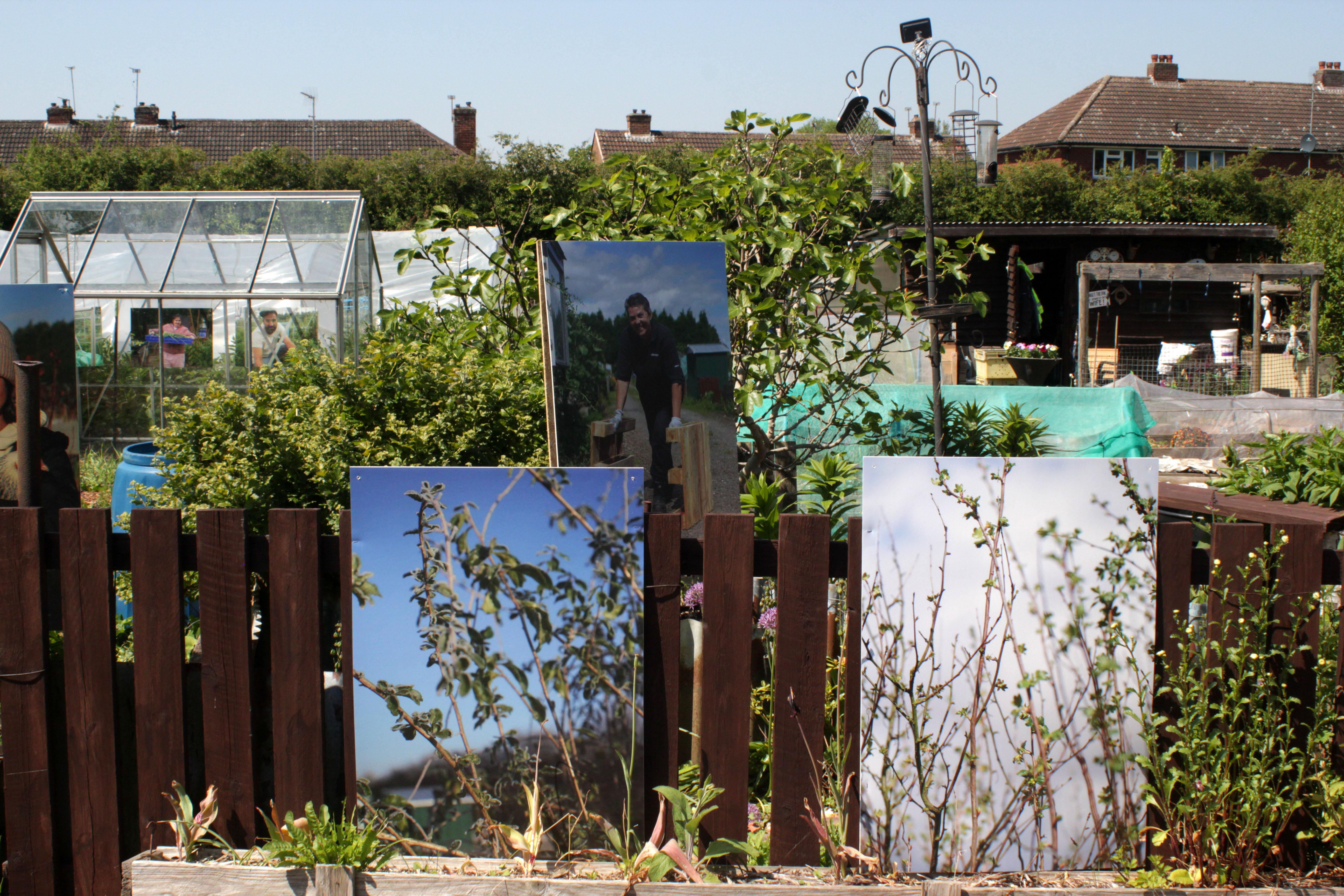 The project culminated in the form of an exhibition located on site at the allotments. Featuring Ayesha's photographs, the exhibition echoed the values Nev and No Diggity Gardens have: namely having as little impact on the environment as possible. And so, we decided to print all of the photographs on recyclable board, aside from six photographs that were printed on biodegradable paper, with aqueous inks, with the intention of placing these in the compost.