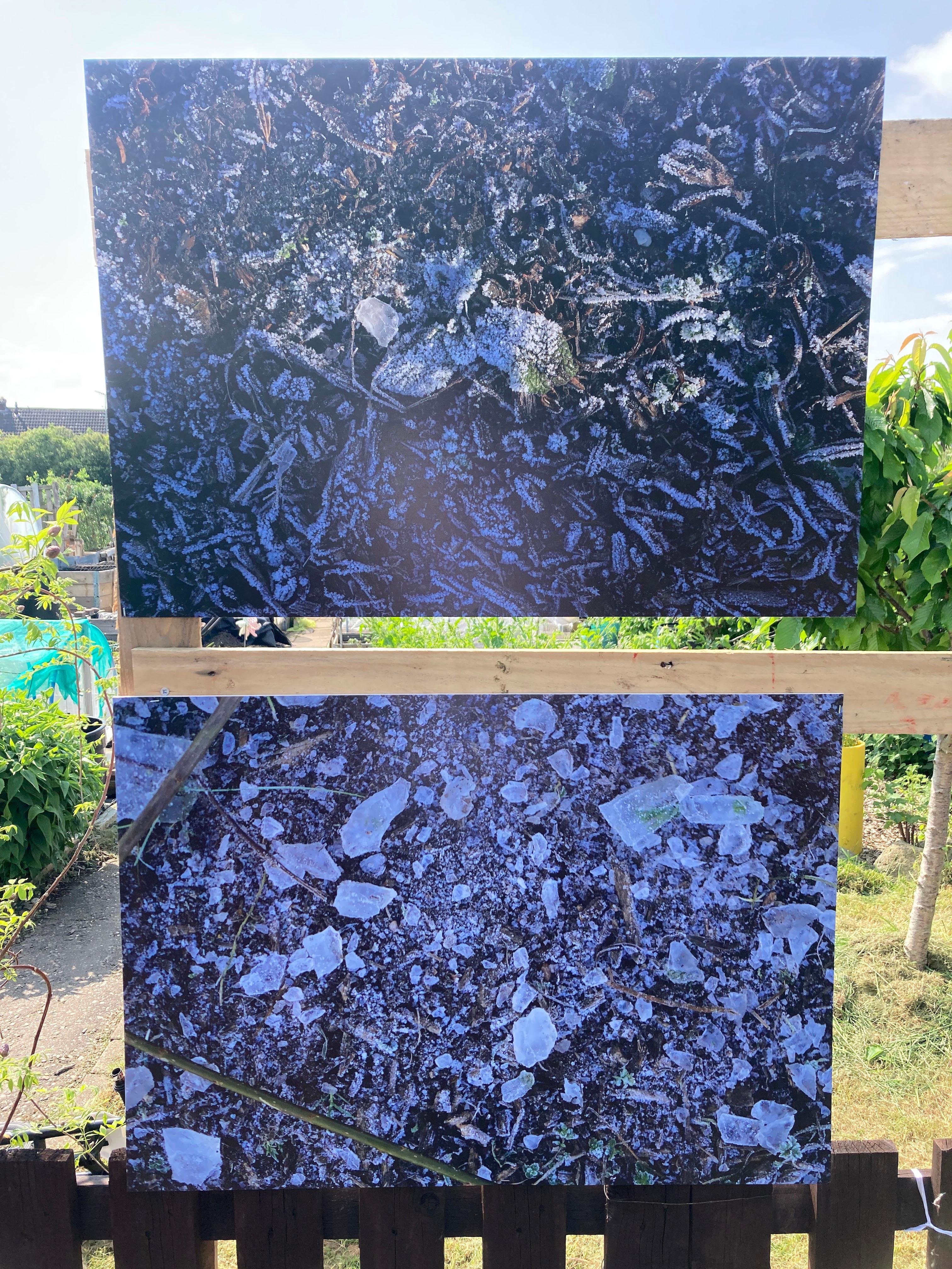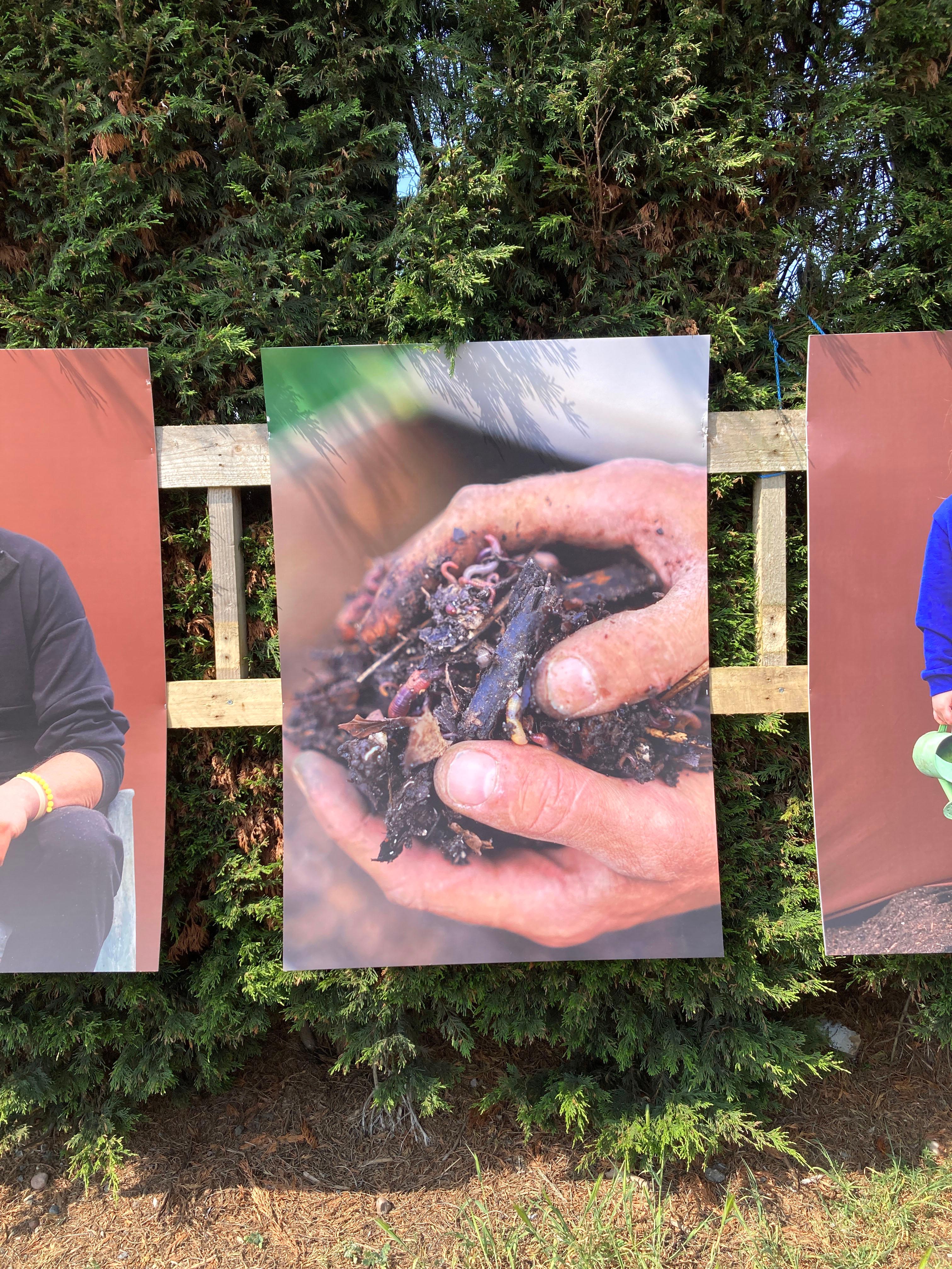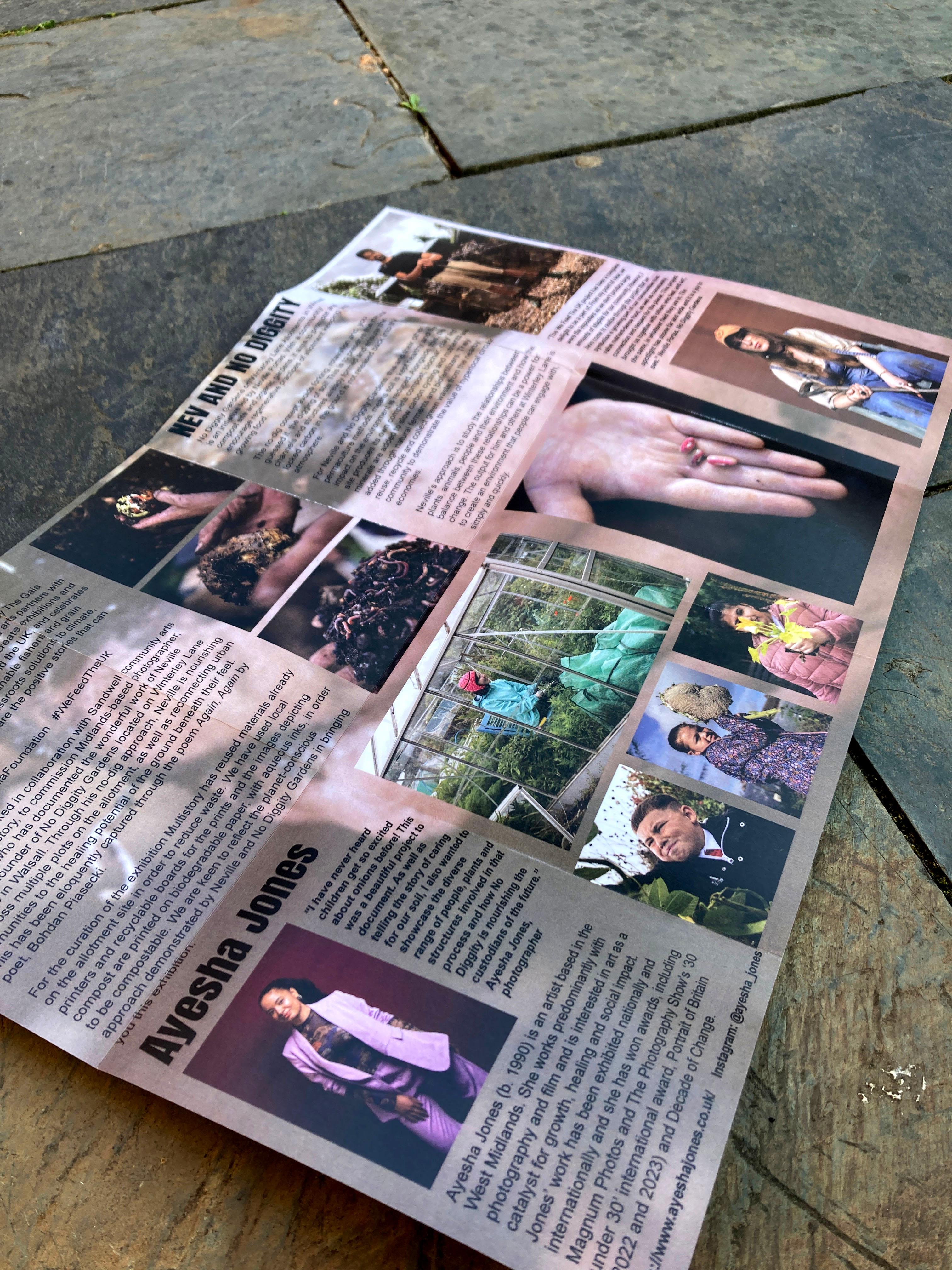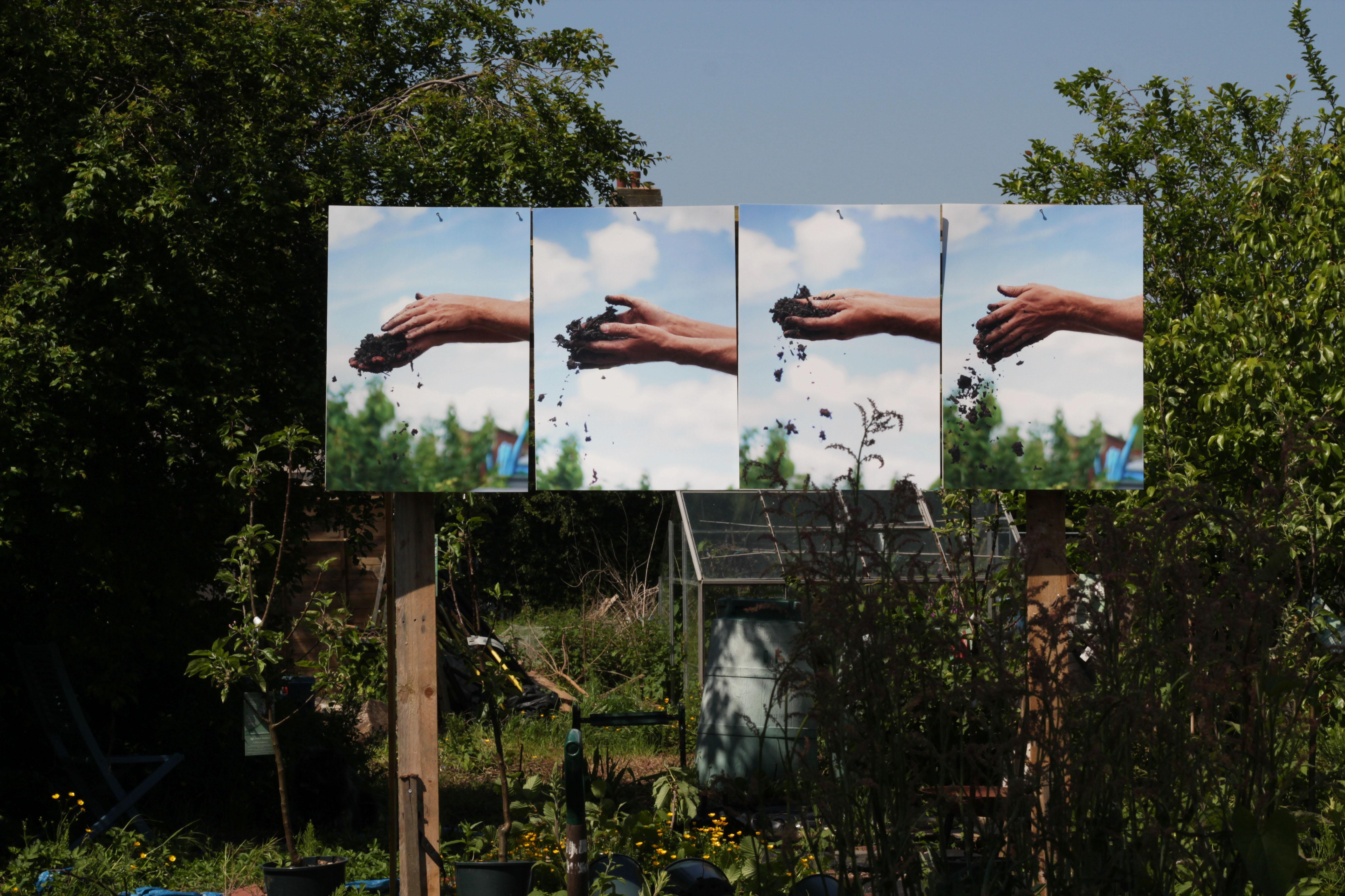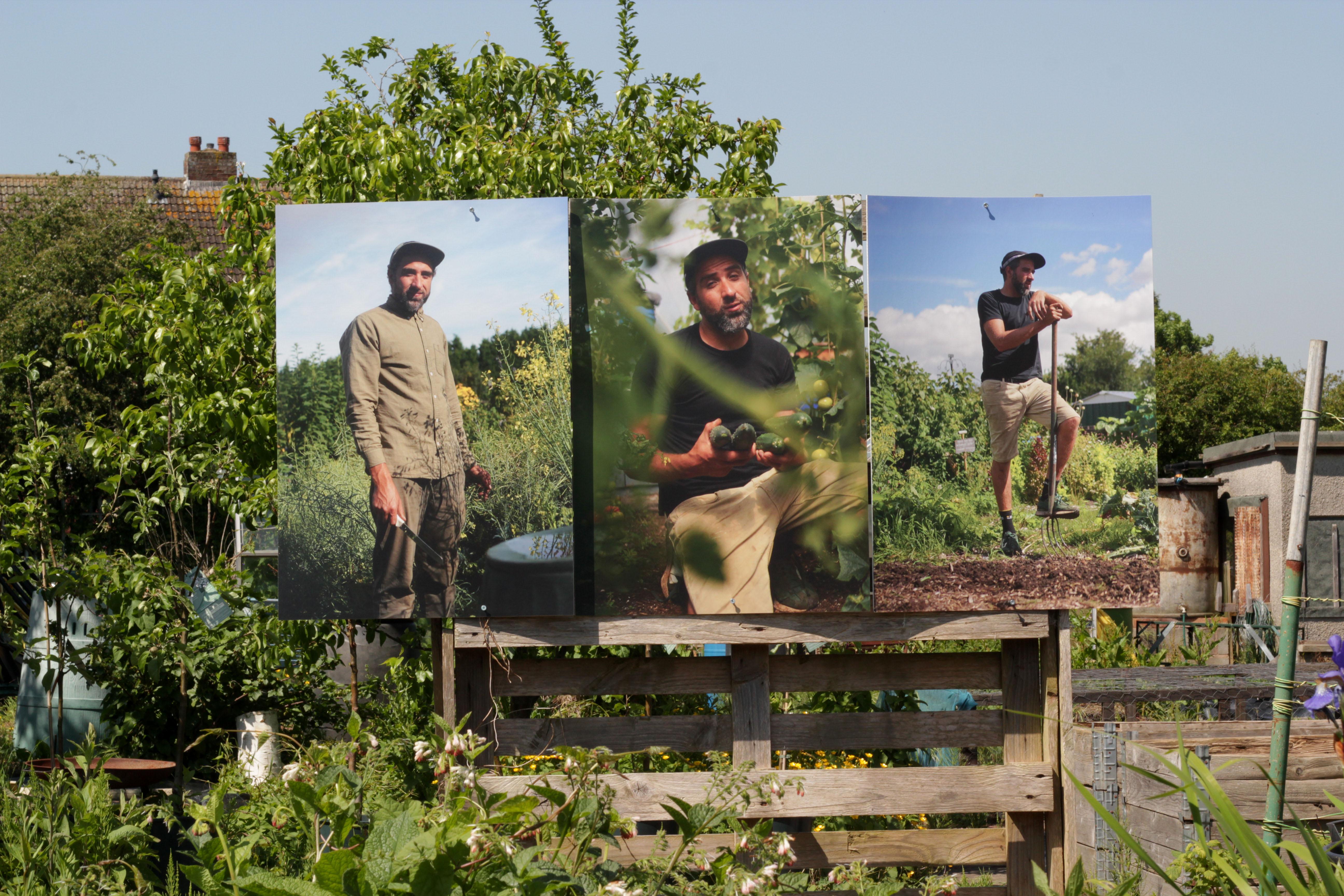The project culminated in the form of an exhibition located on site at the allotments. Featuring Ayesha's photographs, the exhibition echoed the values Nev and No Diggity Gardens have: namely having as little impact on the environment as possible. And so, we decided to print all of the photographs on recyclable board, aside from six photographs that were printed on biodegradable paper, with aqueous inks, with the intention of placing these in the compost.