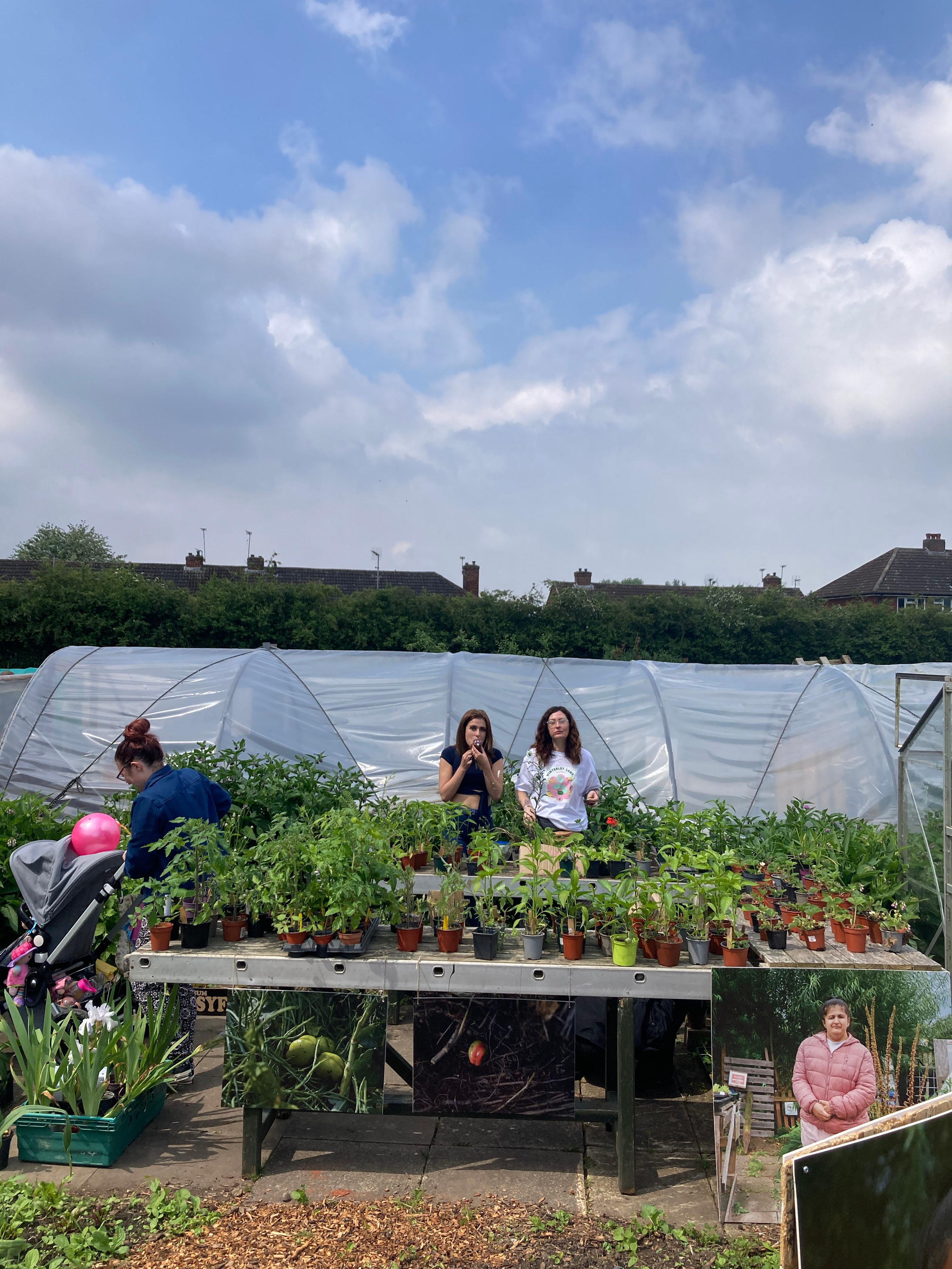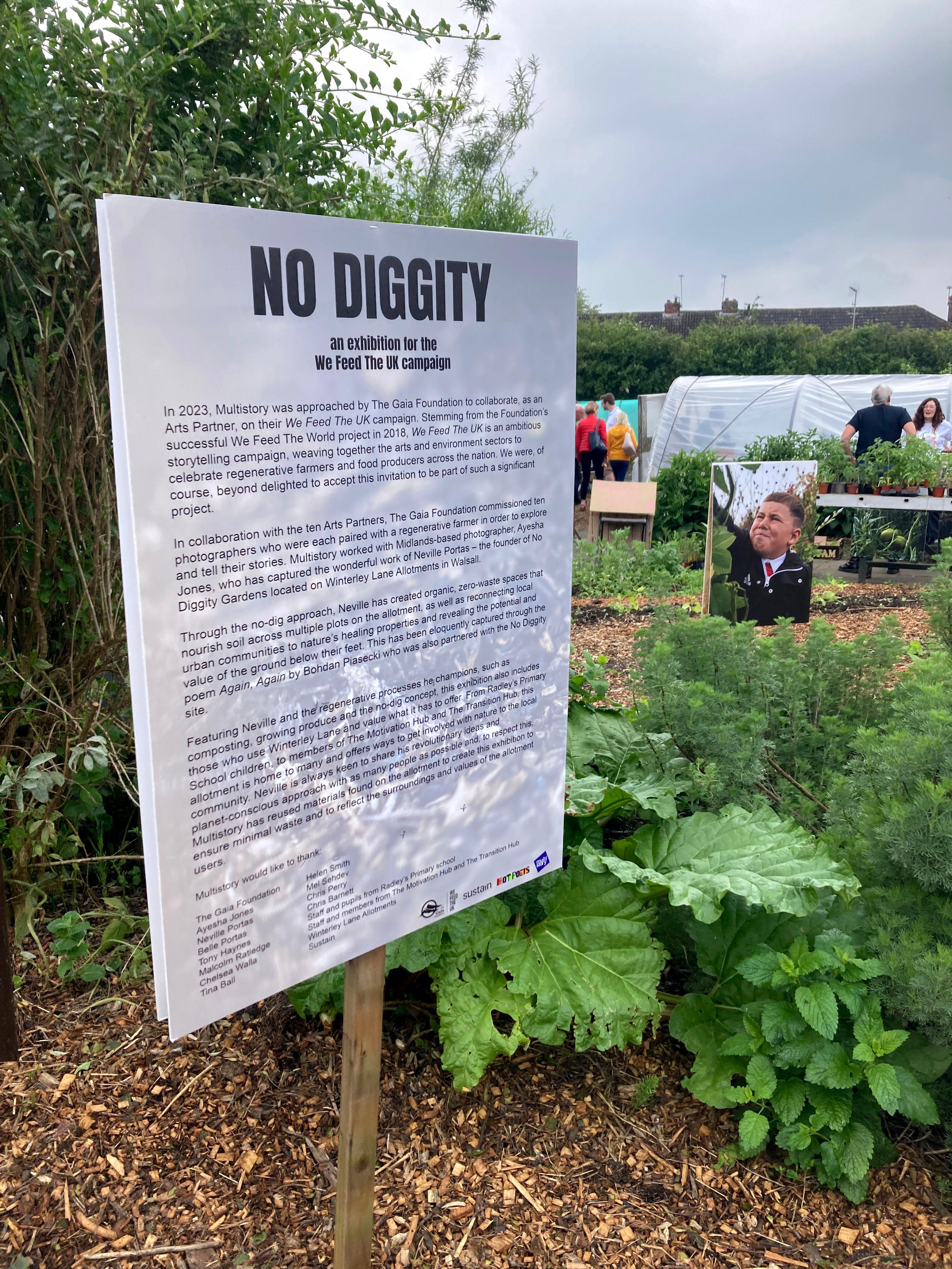 On Saturday 18th May 2024, our long-term project We Feed The UK: No Diggity in collaboration with The Gaia Foundation opened at Winterley Lane Allotments (WLA) as a pop-up exhibition and a day of performance and activities. After a year spent at the allotments, Midlands-based photographer Ayesha Jones' photographs that captured the n0-dig approach of Neville Portas were finally displayed in amongst the plots and greenery. Read on to find out more about the exhibition and the opening day.