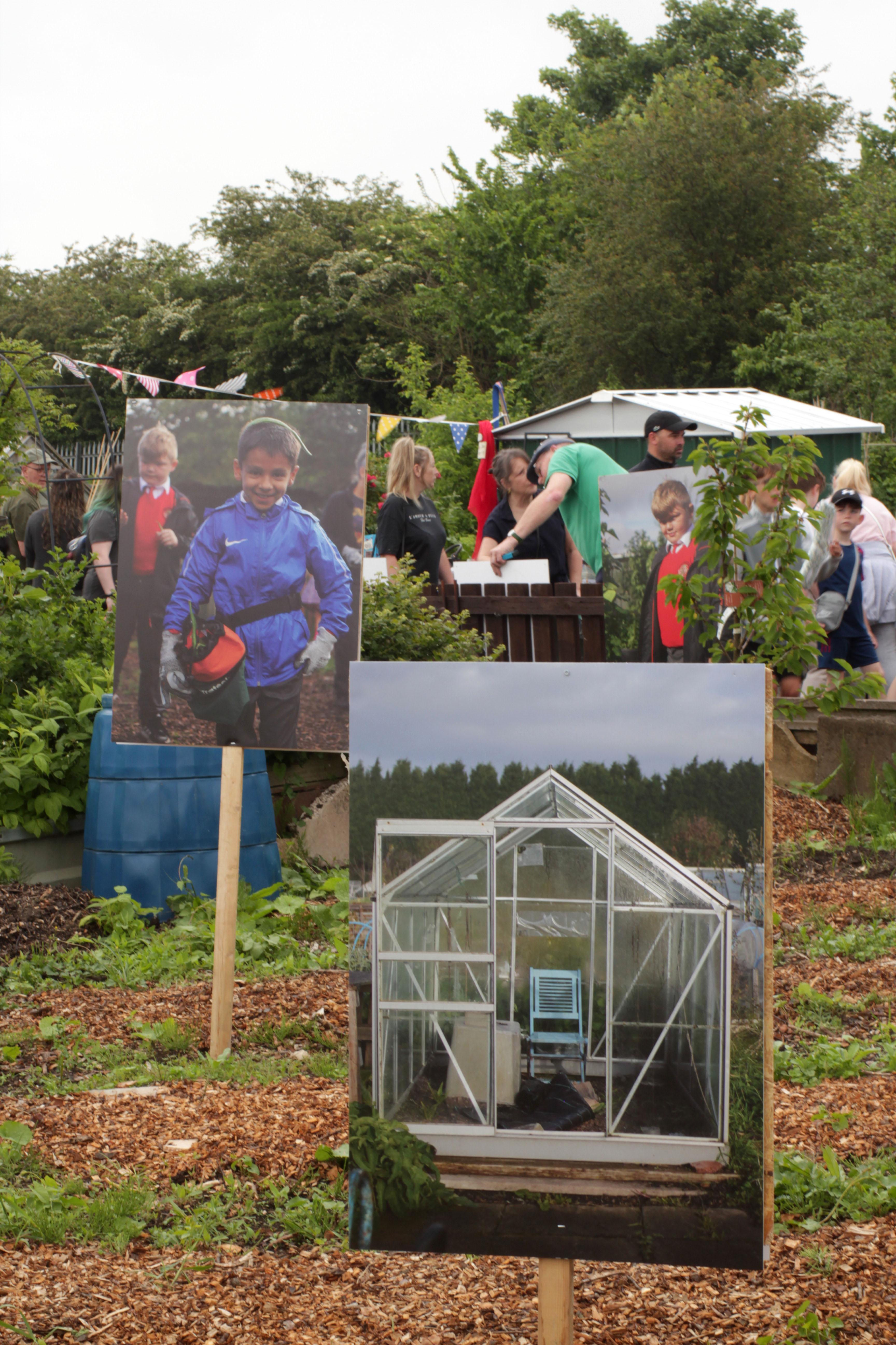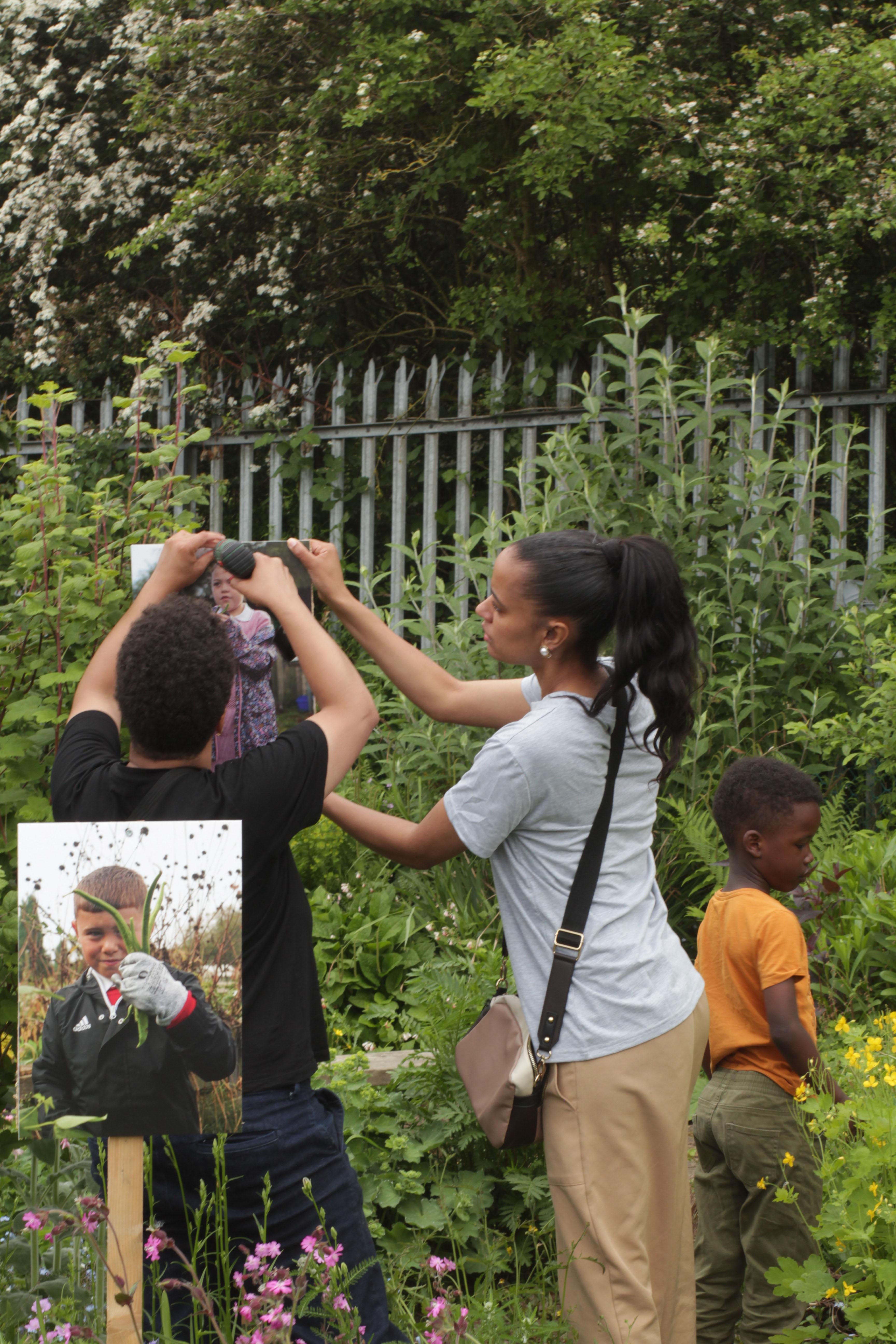 The morning of Saturday 18th May began with installing the photographs. With the combined effort of Nev, Helen, Tina, Andy, Ayesha and Multistory staff, over 80 prints were put up across the site. Using materials already found on the allotments (such as wooden stakes and chipboard), which were then fabricated into display stands by Neville, we were keen to reflect his planet-conscious approach by re-using materials and printing on recyclable/biodegradable material. This approach also extended to the curation of the photographs and wanting them to sit naturally in the setting, rather than disrupting it.