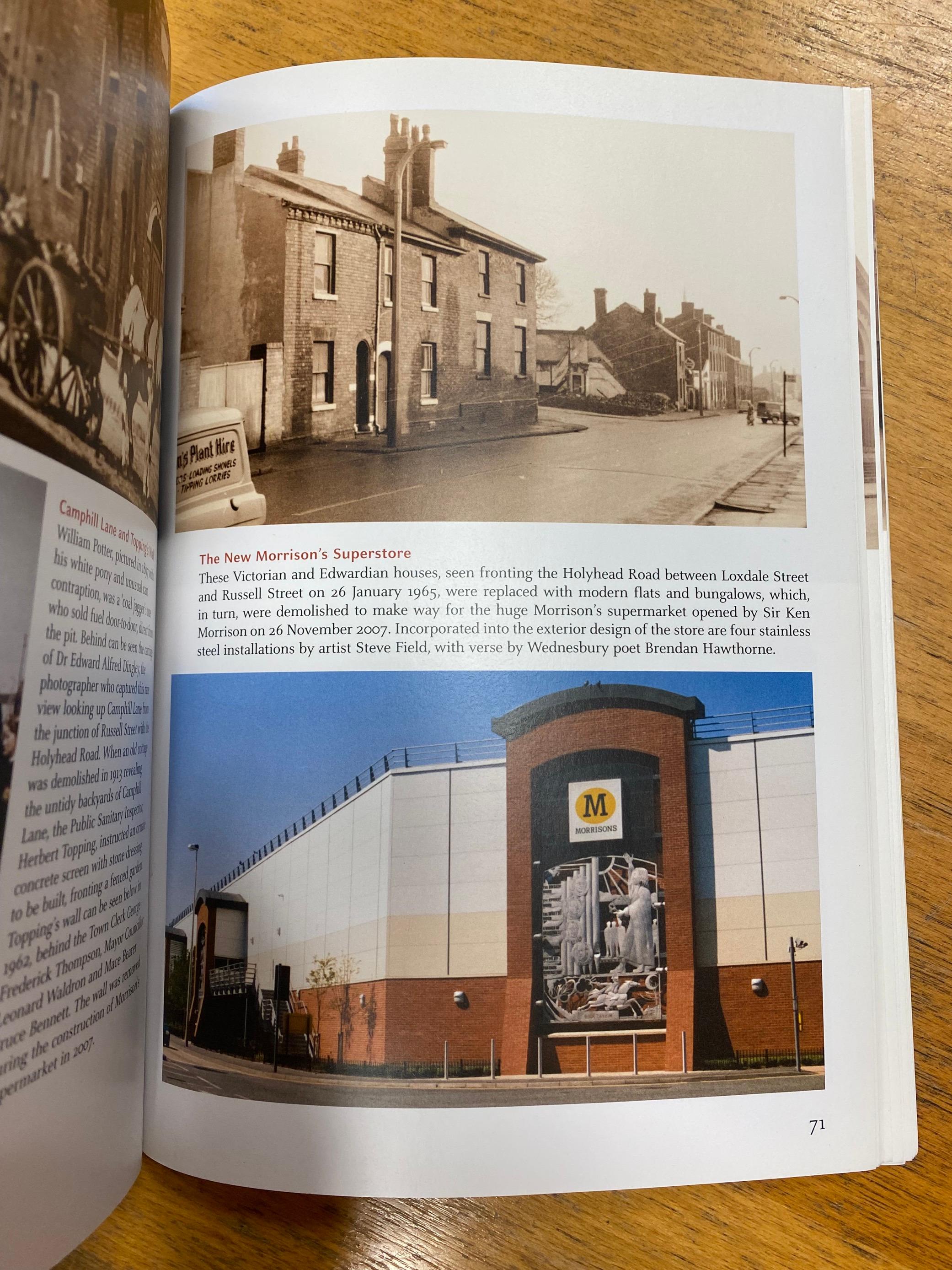 This book was written by Ian M.Bott and it's about how the town has changed over the years. It shows before and after photos of the roads and how time has influenced the modeling of buildings. For example, the photograph below is one of the pages in the book, it shows the Victorian and Edwardian houses that were demolished so a huge Morrisons could be built in its place which was opened on the 26th November 2007 by Sir Ken Morrison.