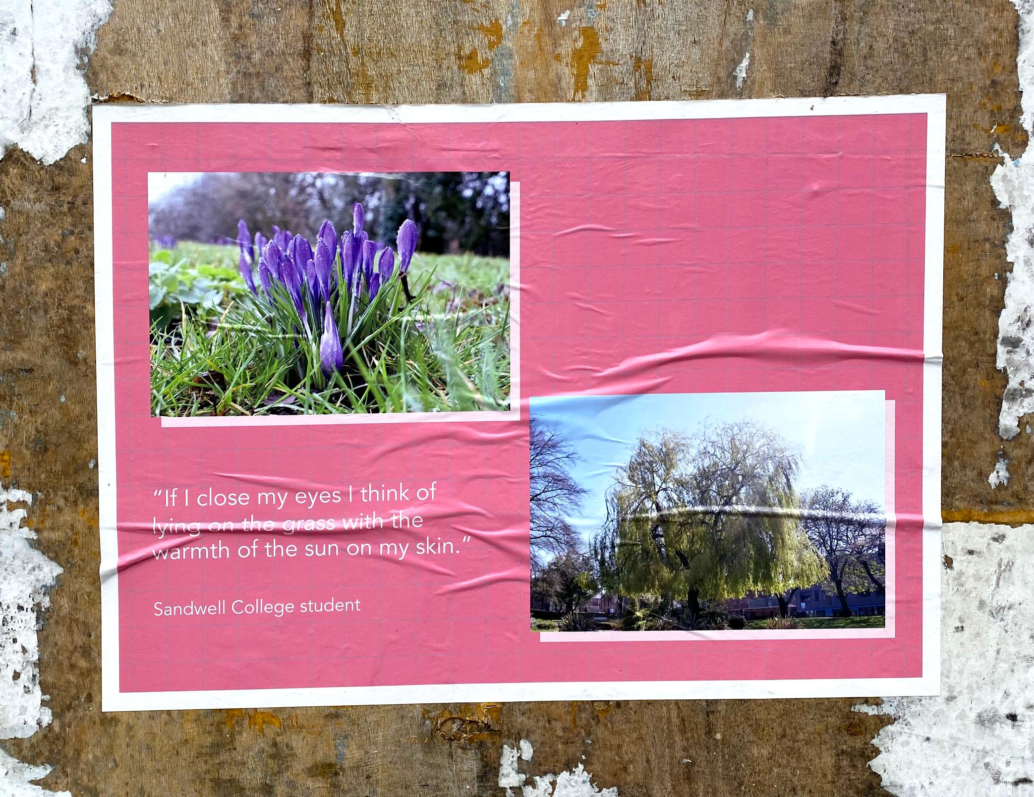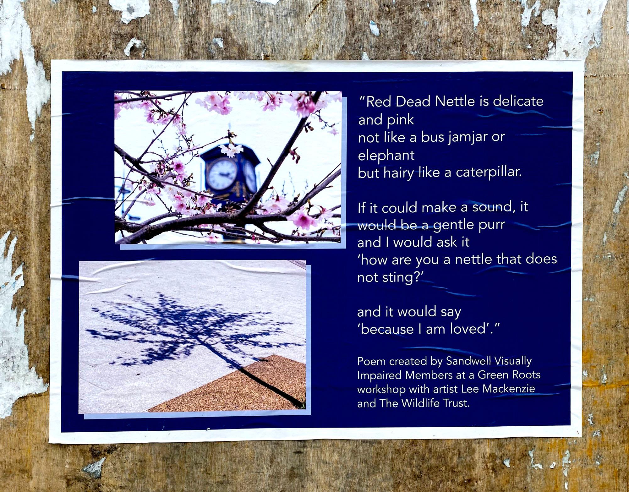 Another part of my work experience was to walk along West Bromwich High Street to look at the exhibition that the Photography students at Sandwell college did as part of Multistory’s Green Roots project. The exhibition is called ‘Change Is Coming’ and is about the photography students being more aware of the environment around them. They were asked to take 3 photographs of nature around West Bromwich. The students were really involved in this exhibition because they got to choose the photographs they liked the most and then they stuck their own posters up themselves. This also allows the public to see the exhibition and read the students poems which hopefully inspires them to be more aware of the nature around them.