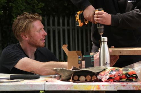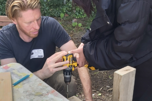 Dale Hipkiss teaches a student how to use power tools whilst constructing the bench, 2024 © Multistory