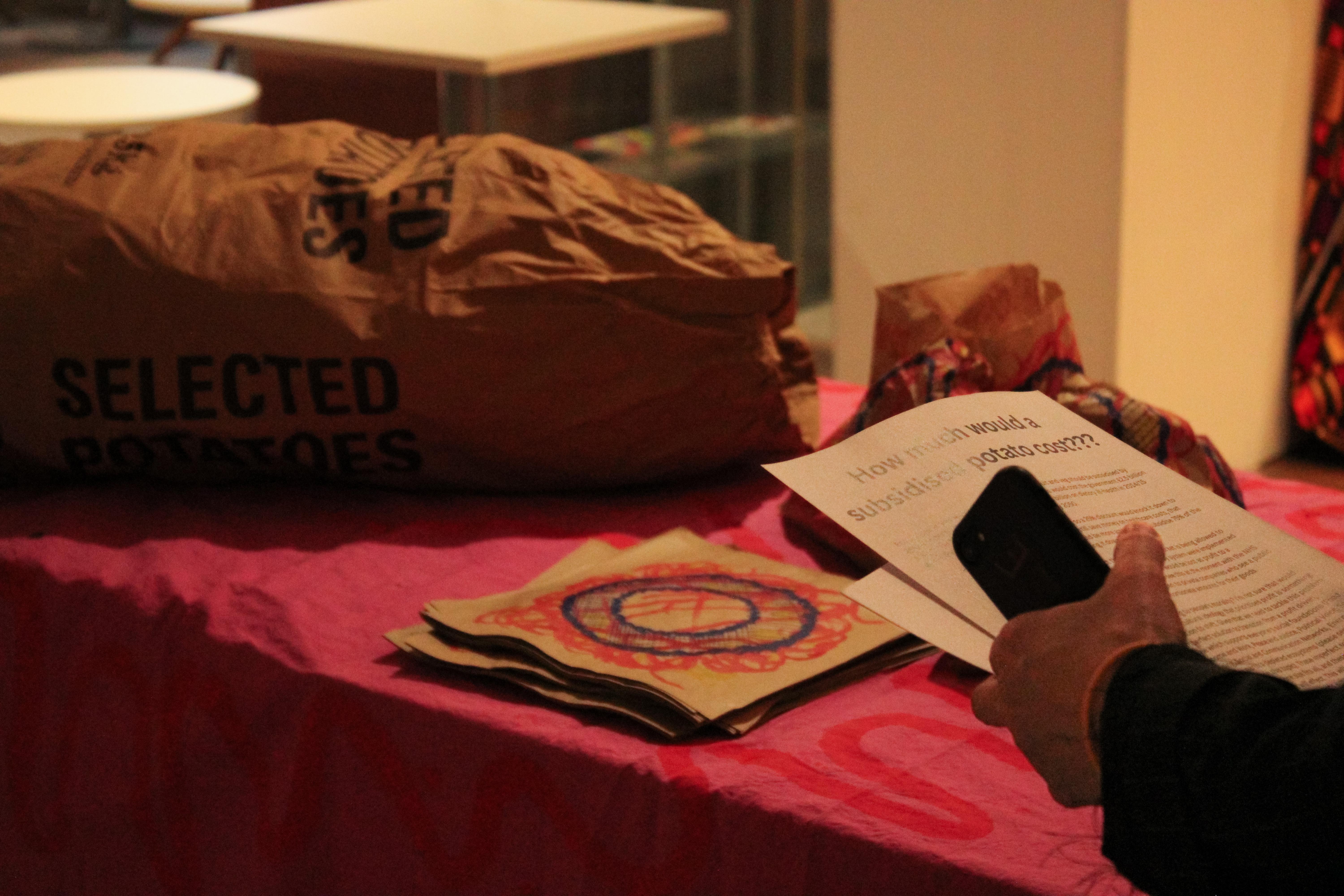Good Food Should Be A Lot Cheaper Than It Is Now! For his residency, Dale set up a small shop in the residency studio, handing out food in exchange for peoples thoughts on the economy and a constructive conversation about how things can be made better. Students mapped how they spent their time and contemplated what they value. Subsidising food at the point of sale is just one of those ideas that would instantly improve people's lives! The “free market” is really bad at looking after the physical, emotional and mental health of the vast majority of people. Wealth accumulation helps very few and is awful at discerning where resources should be distributed. Subsidising food at the point of sale is just one way to redistribute wealth. To not do so is a political choice. Doughnut Economics describes letting go of growth as the indicator for a healthy economy and proposes that an economy should be judged healthy if it meets the needs of its people without eroding the environment. Brown paper bags which were used to distribute food have been used to promote this economic theory and were presented in the exhibition to distribute potatoes.