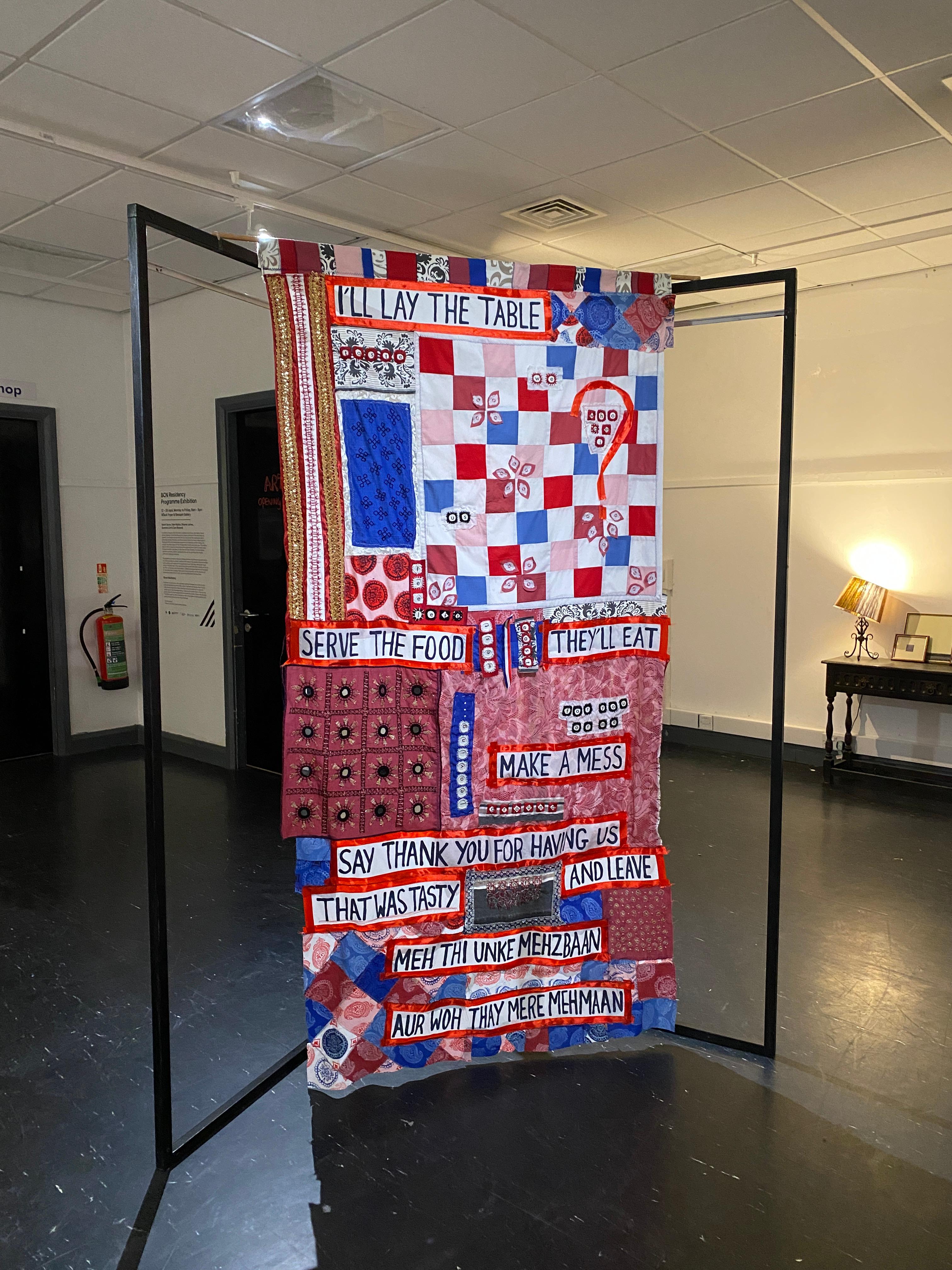 FEAST ON ME is a new textile work informed by an exploration of the duality of the artist’s British and Pakistani identity, the relationship between coloniser and colonised and what that means in relation to her and how she makes work. During her residency, Zara held a series of participatory workshops where students of The Wolverhampton School of Art were invited to make work and respond to the legacies of the BLK Art Group. FEAST ON ME interrogates the legacies of colonialism and questions the expectations often placed on artists of colour to share their experiences of trauma for white audiences; the artist chose to position the artwork so that the public is met with the back of the work as they enter the gallery space.