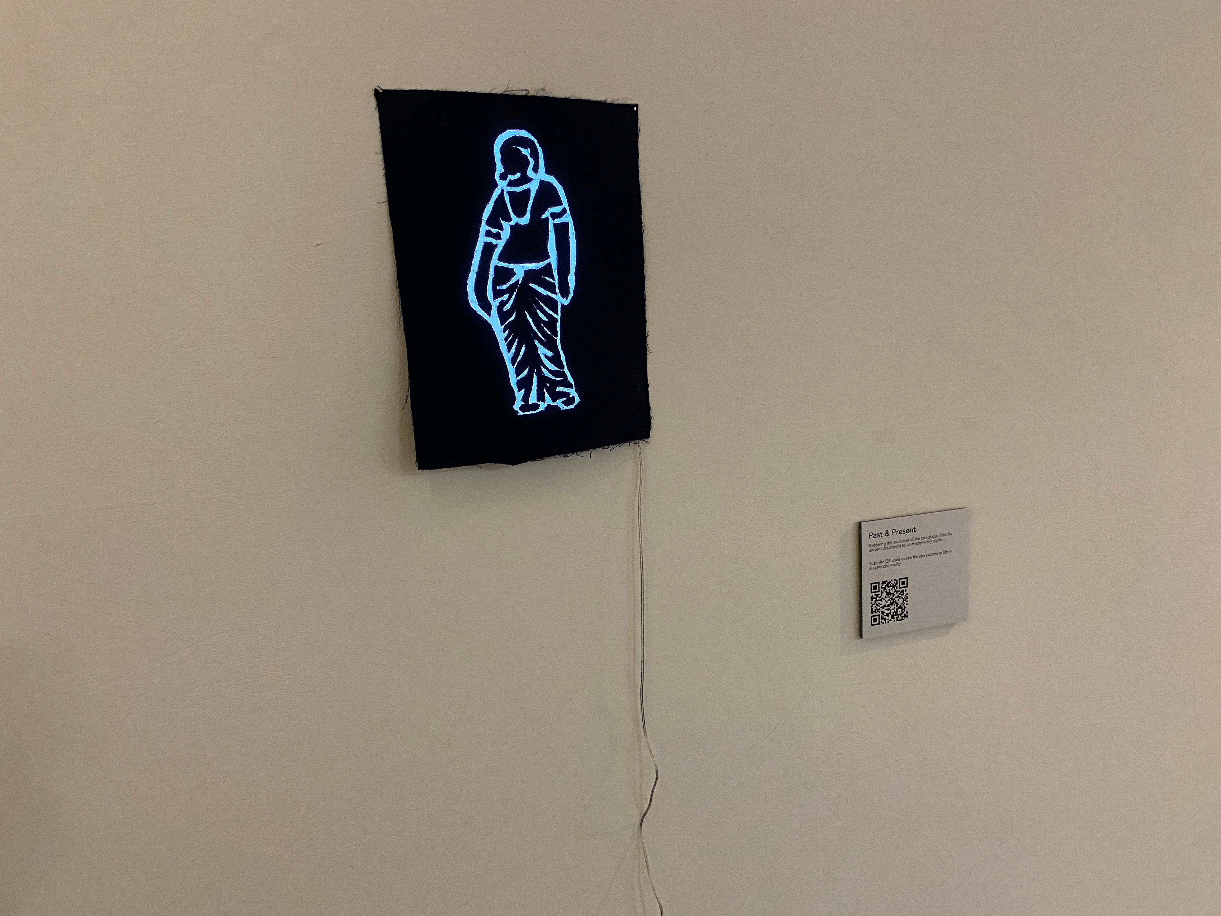 For Daya’s residency, she focussed on experimenting with new materials and ways of making work, and initiated a new project titled Sari Stories. Sari Stories delves into the sari beyond its use as a garment, as a symbol rich with cultural, emotional, and historical significance. The work draws upon the sari’s deep connection with South Asian cultural traditions, and ability to transcend borders and travel across different regions. The artist incorporated scent and touch sensors to create interactive experiences that invite viewers to participate in the storytelling. In 'Scent & Memory', scents like sandalwood and turmeric evoke the warmth of home and memory, and the sari becomes a dream space which transports the viewer home. 'Protector' explores the spiritual significance of the sari being a protector of energies, and 'Past & Present' explores the evolution of the sari drape, from its ancient depictions to its modern-day styles. The artist incorporated elements like sound and touch sensors, scent and glow to create interactive experiences that invite viewers to participate in the storytelling.