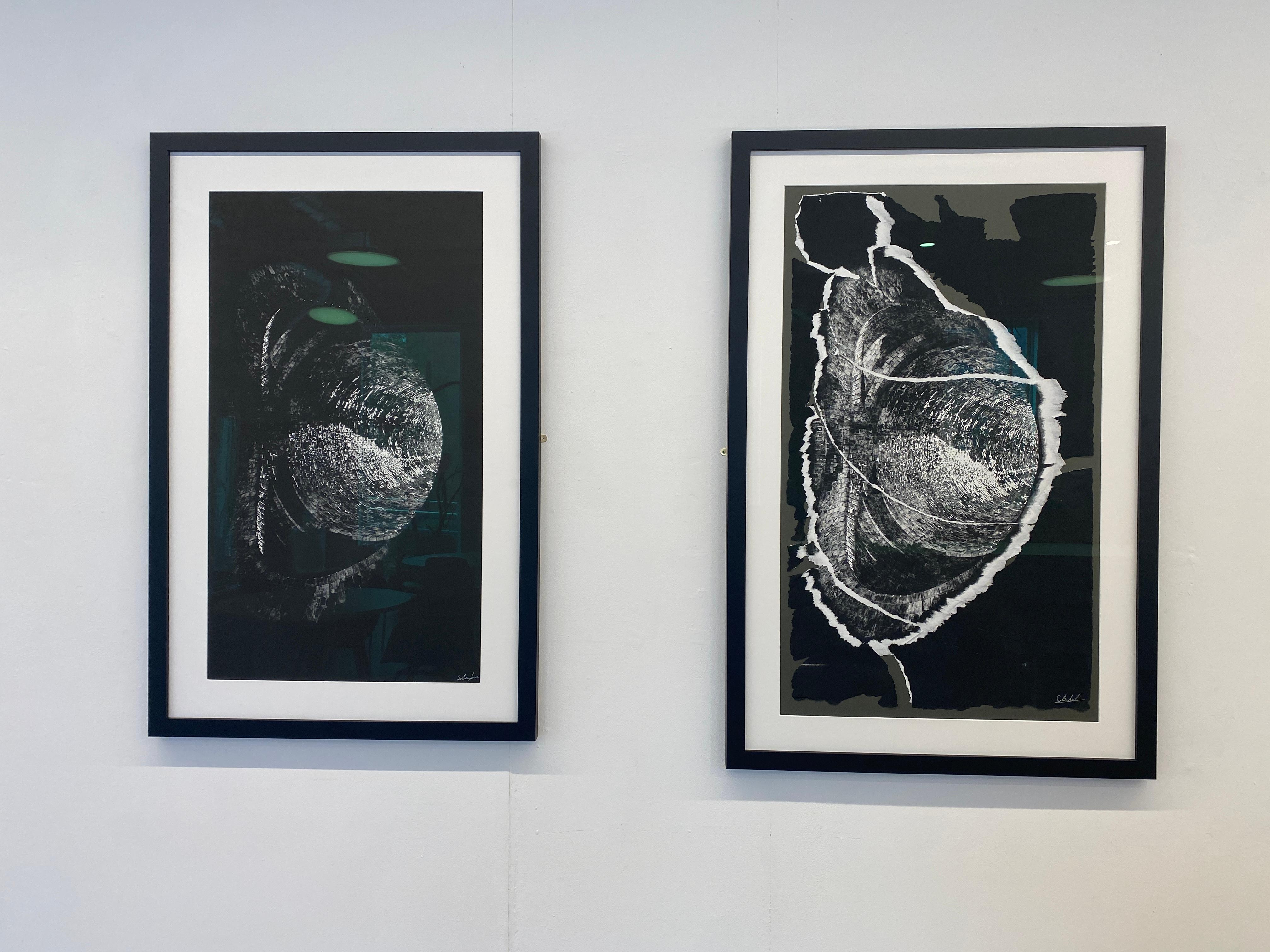 Satinder Parhar has long produced large scale dry-point prints, which explores the concept of interstitial spaces. Fascinated by natural and man-made apertures; he explores empty spaces such as tunnels, vents, caves, fissures etc. These forms create an intervening space called an ‘interstice.’ It examines the structures, the interstitial spaces formed within and its relationship with the “object.” Do they supplement or oppose each other? The use of black and white emphasises the disparity and the unity between the interstice and interstitial space. The two colours oppose each other, yet work together. The viewer is immersed within this re-representational space through the size of the prints. Both exist in the realm of one another.
