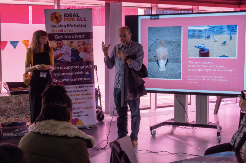 Sandwell College Photography lecturer John Edwards gives a talk at the Change is Coming exhibition launch on West Bromwich High Street, June 2023 © Multistory