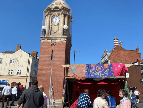 Between 2021 and 2022, artist duo Hipkiss & Graney co-produced the art project MARKET alongside Wednesbury residents. The group created new fabric banners in a series of textile and storytelling workshops, and their work was shared at a community celebration of the refurbished clocktower in March 2022.