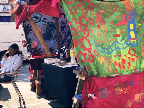Market stall featuring the hand-painted fabric by participants in Wednesbury (Market Place) for the MARKET celebration event_2022. ©Phillip Parnell