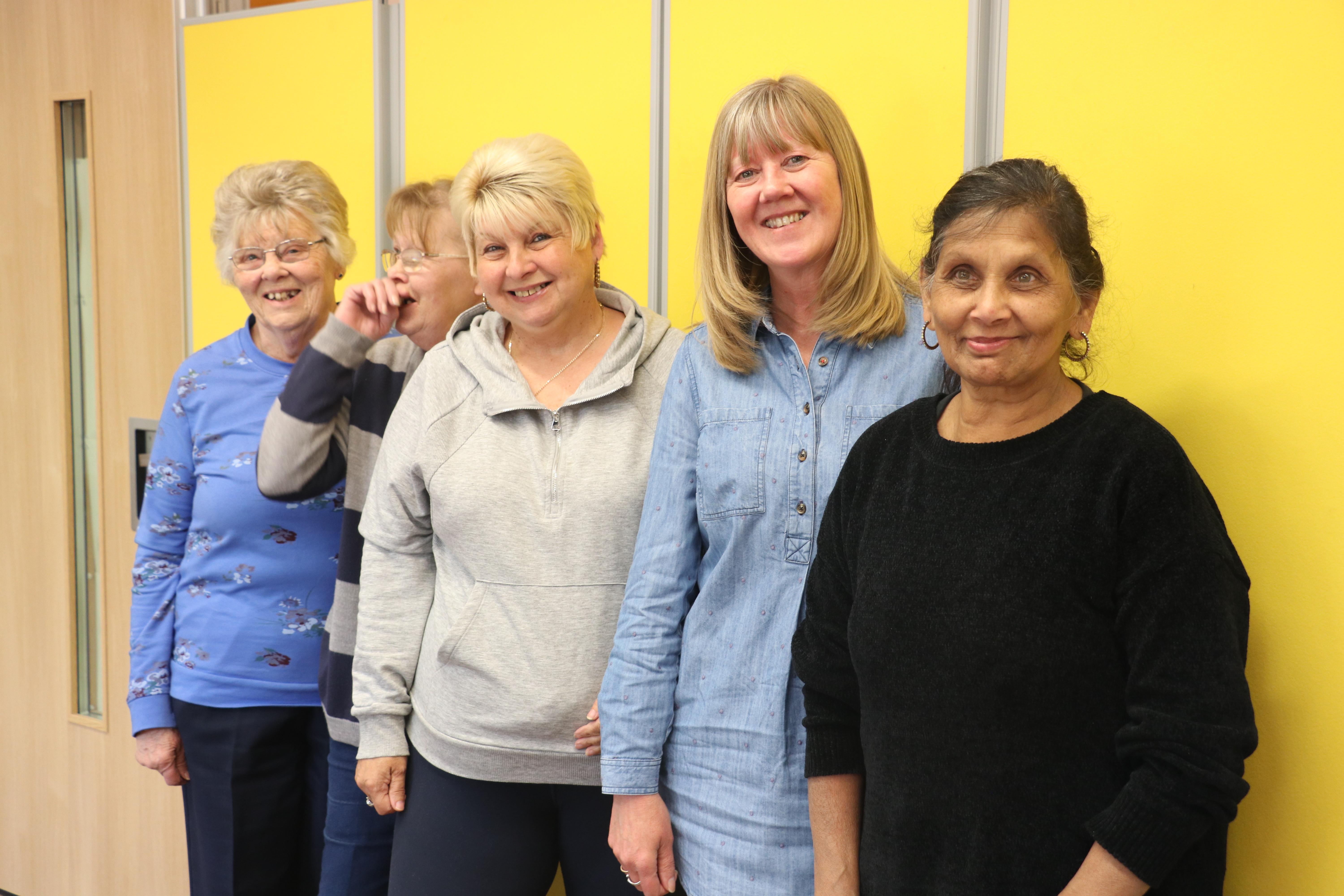 J workers Pat, Wendy, Caron, Janet and Nim at collage workshop, Oak House in West Bromwich © Sophie Huckfield