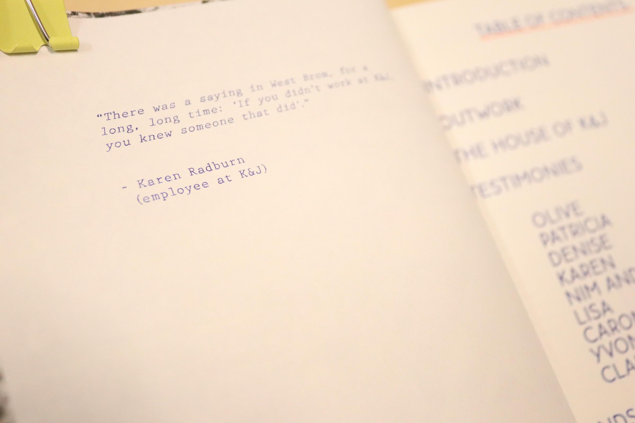 Olive: “K&J was a big part of the West Bromwich employment scene and this book importantly reflects that from the working women point of view. The whole experience of taking part has been really rewarding memory wise. My time at K&J and my relationship with both friends and management have been a great influence on who I am today. I would like to thank Sophie and Jess for the opportunity this project has given me.”