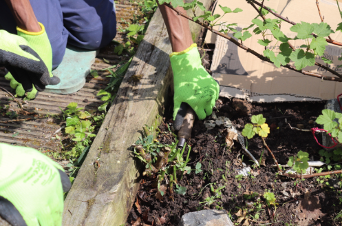 Students using a trowel to remove roots from a planter, May 2024 © Multistory
