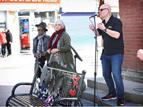 Suzan Spence performing their piece for Wednesbury Tales in Wednesbury Town Centre_March 2022. ©Phillip Parnell
