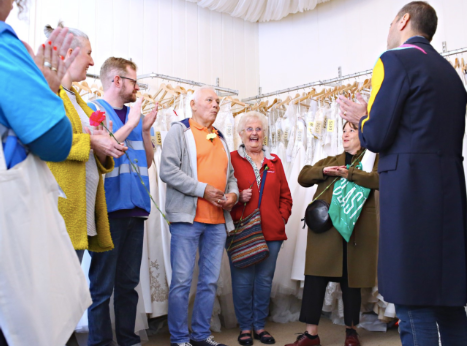 Tour guide Vimal Korpal talking to participants during a tour of Wednesbury shops/businesses for the What’s In Store Festival. Here, they are gathered in Simone’s Bridal_September 2022. ©Phillip Parnell