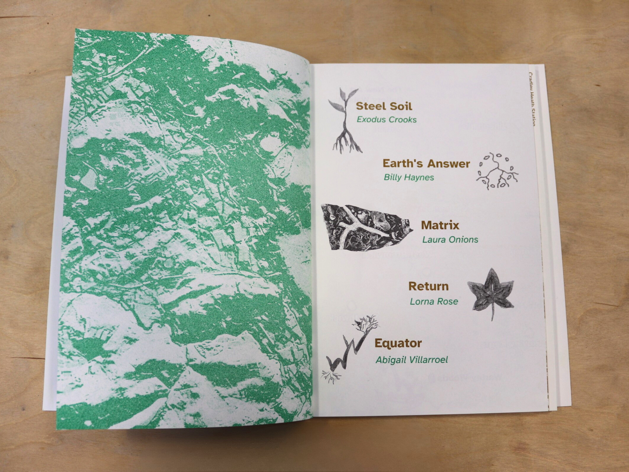 The journal has been designed, printed and bound by The Holodeck, a printmaking and design studio founded in 2013 in Birmingham, specialising in Risograph, Letterpress, and traditional printmaking techniques. Printed in flat gold, green and black risograph.